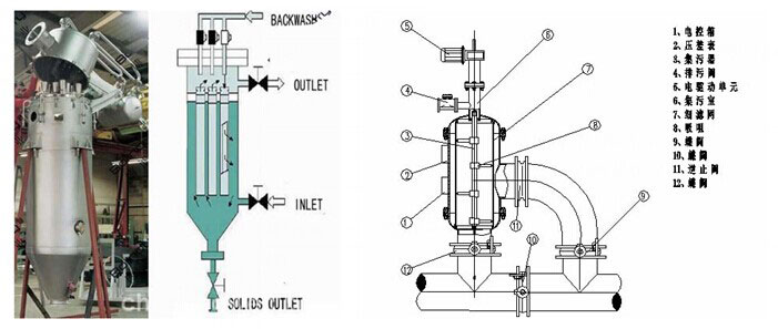 4、PLC控制:過濾器配有全套控制系統(tǒng),在進(jìn)出壓差達(dá)到給定值(可調(diào)),控制系統(tǒng)發(fā)出指令,啟動反吹程序,令濾芯分組按程序進(jìn)行反吹,使壓差恢復(fù)到原始值,使設(shè)備達(dá)到不間斷連續(xù)運(yùn)行;