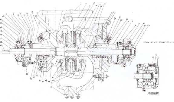 AY型油泵分為單級(jí)單吸和兩級(jí)單吸懸臂式,單級(jí)吸懸臂式、單級(jí)雙吸和兩級(jí)雙吸兩支承式,兩級(jí)單吸兩支承式等六種,結(jié)構(gòu)型式如圖一至圖六。